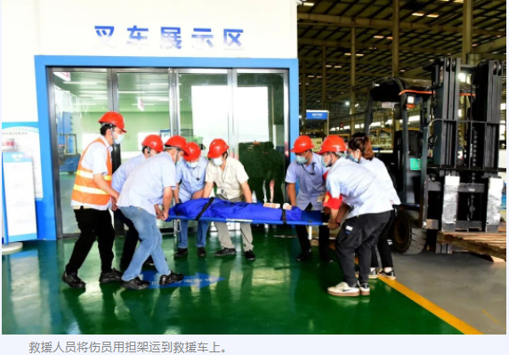別擔心!這是韶關(guān)市比亞迪實業(yè)有限公司正在開展叉車應(yīng)急救援演練活動,現(xiàn)場模擬一名叉車司機在駕駛叉車時違章操作,導(dǎo)致一名員工被撞倒,隨后立即啟動公司救援預(yù)案采取的一系列措施的情境。