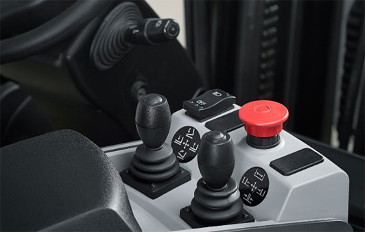 車輛配置雙搖桿,360°輕松操作,高效實(shí)現(xiàn)門架前傾/后傾及貨叉?zhèn)纫频炔僮鳎嵘嫒〉木珳?zhǔn)度。
